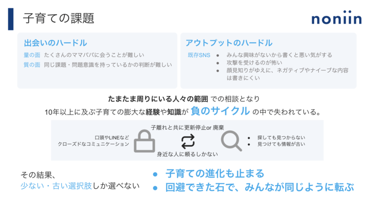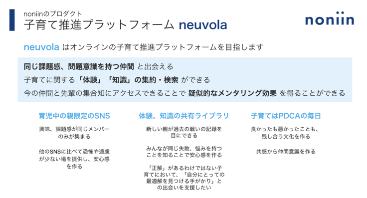子育てを”孤”育てにしないために、子育て情報を閉じたコミュニティで終わらせなように「neuvola」という仕組みを通じて、新しいカタチの「チーム育児」を作り上げていきたいと思っています。