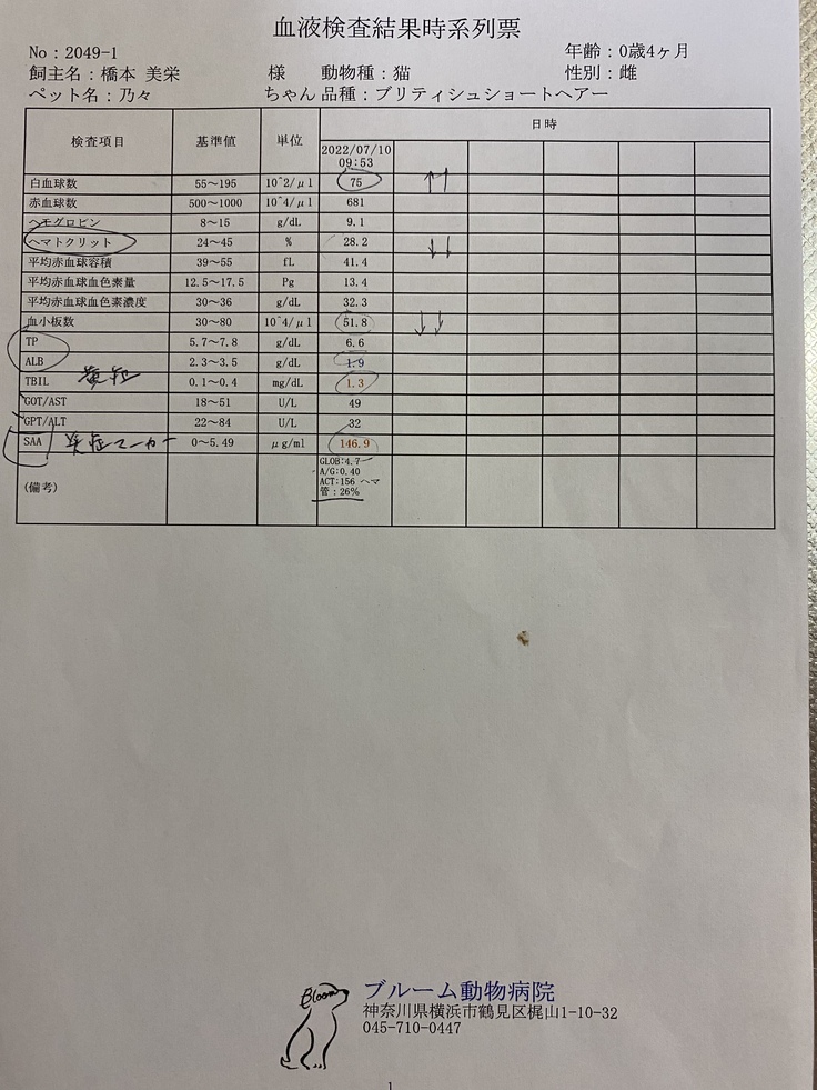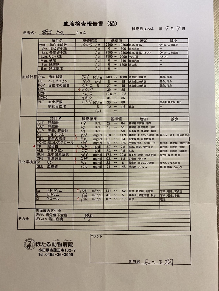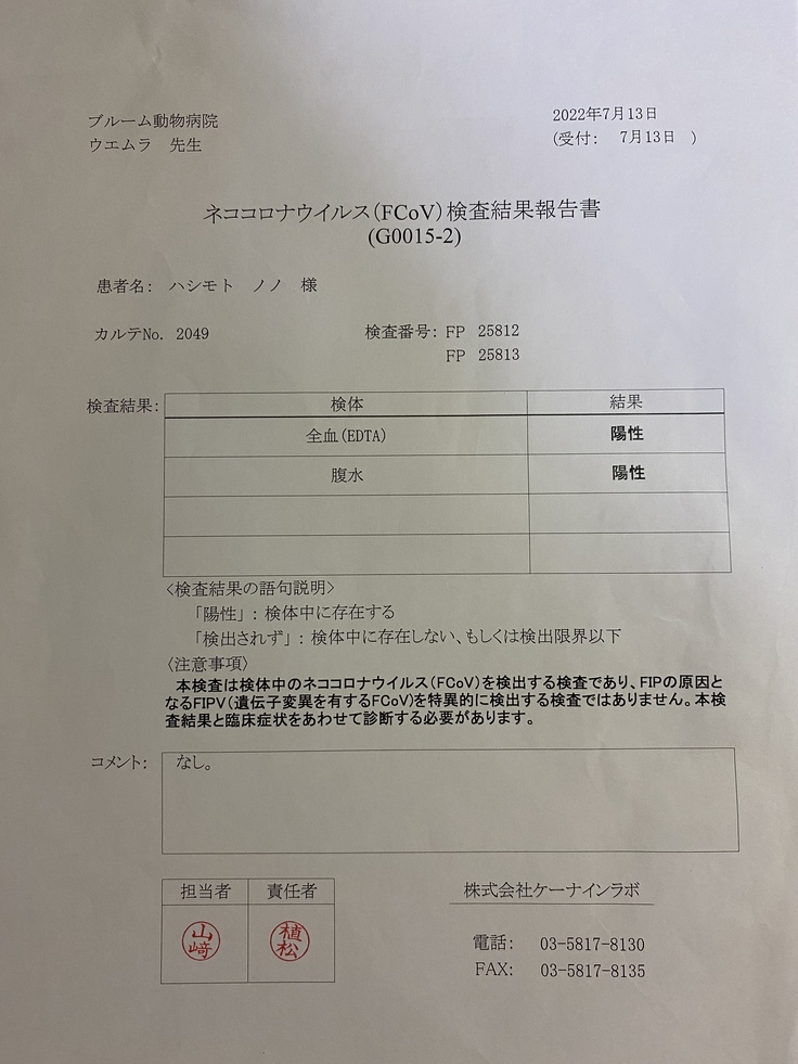 病院からは【猫伝染性腹膜炎FIP】疑いと。