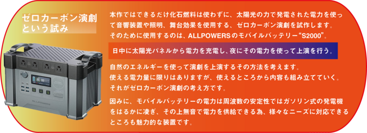 例えば、上演中の電力に太陽光発電を使用し、充電が100%にならなければ上演しない“天候次第の不定期開催”として行なった、『ロレンスの雲』(2023年4月)など。