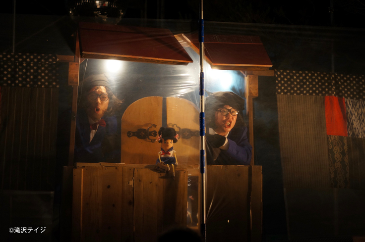 舞台前面とふたりの役者間にビニール幕をはり、飛沫感染対策を行なって上演された人形劇。