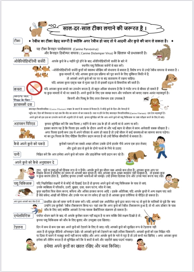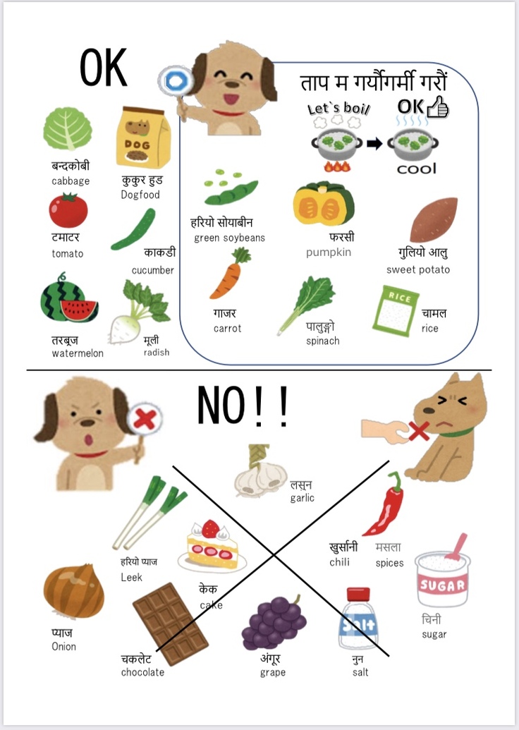 そこで、私たちは食べさせていけない物リストや飼育方法などを説明したマニュアルや動画を、4か国語で作成しつづけているのです。(以下はネパール語とヒンディー語のマニュアル例)