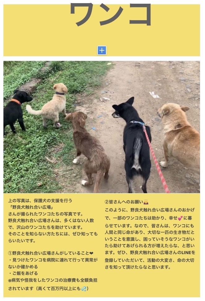 むしろ、一人でも多くの方にこの「野良犬ふれあい広場」を知っていただき、共感、サポートいただければ嬉しいです。