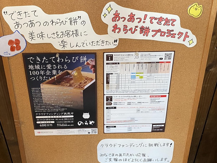 出来立てあつあつのわらび餅をお客様に召し上がっていただき、喜んでもらいたい!!という想いで、のらや川西店にご来店していただいたお客様にもこの活動を伝える取り組みを行っています。