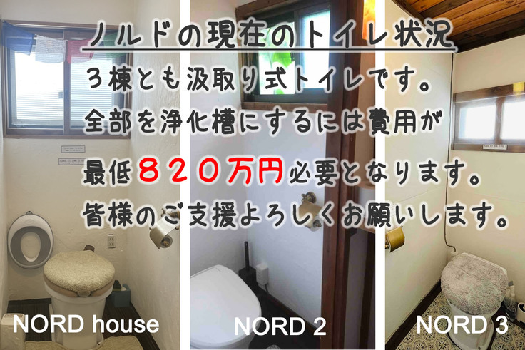 <<支援金の使いみち>> かかる費用の総額:250万円(浄化槽にする工事) 目標金額:第一期目標金額:2,500,000円 NEXT GOAL:2,800,000円 資金使途:NORD3に浄化槽を設置(クラウドファンディング手数料30万円+税3万円 リターン含む) <<スケジュール>> クラウドファンディング終了 : リターン発送 :クラウドファンディング終了後、概ね2週間を目処に発送いたします(発送が遅れる場合はご連絡いたします。) 工事着工 :2024年5月予定