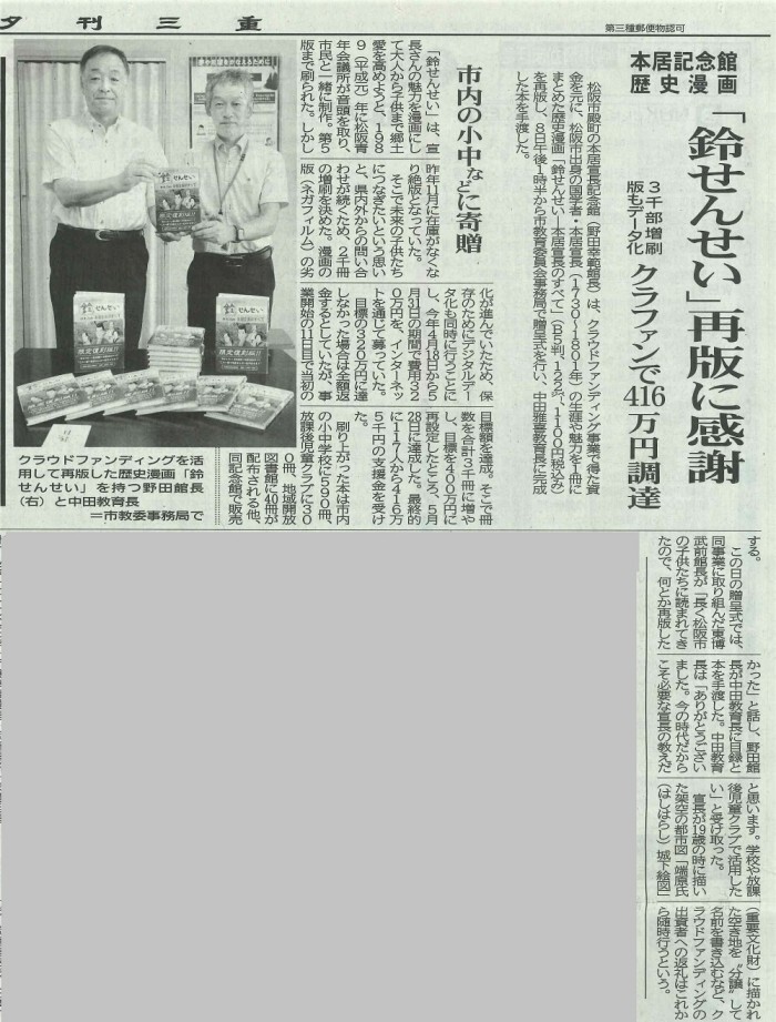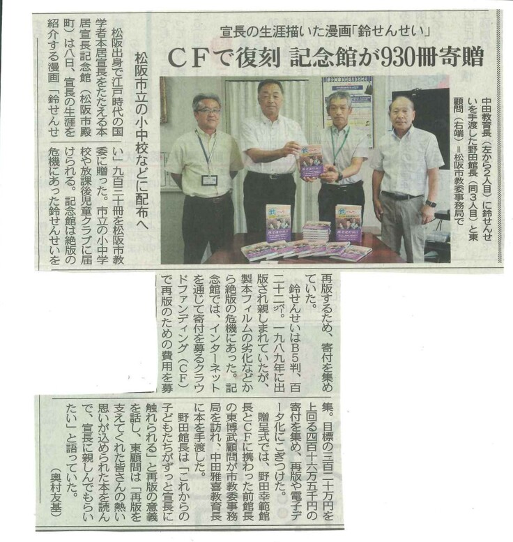 8月8日(火)に、「鈴せんせい」930冊を市内小中学校と放課後児童クラブ、地域開放型図書館に寄贈しました。再版に向けた皆様の熱い思いが込められた本がいよいよ学校の図書室に届きます。郷土の偉人「本居宣長」を未来にわたって郷土の誇りとして感じ取っていただくことを願っています。