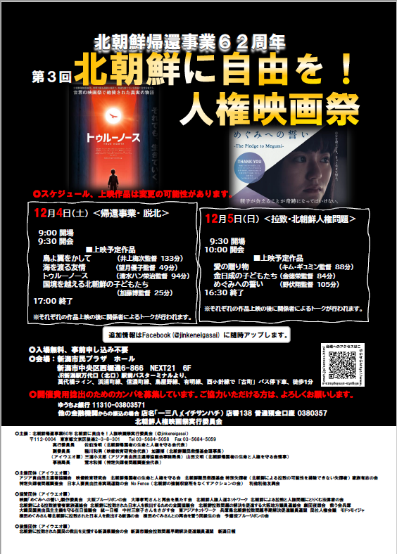 12/4は帰国事業・脱北についての映画、そして12/5は拉致・人権問題の映画となっています。どれもひとつの作品だけでも見る価値があるものばかりです。これが何作もしかも無料で見られる&関係者のトークまであるというのは、貴重な機会と思います。