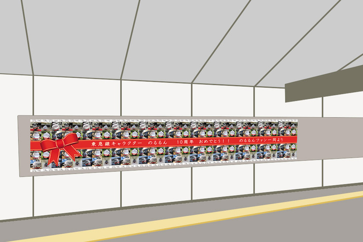 渋谷駅構内にB0サイズポスターを横に4枚並べたロングでビッグなサイズ(縦1,030mm横5,824mm)の、「東急線キャラクターのるるん10周年おめでとう!お祝い推し広告」を、3月のどこかの一週間で掲示いたします。
