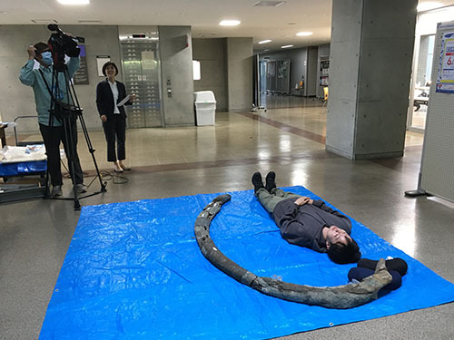 すでに信州大学に運び込んであったクジラの肋骨化石を並べた様子を,カメラマンの方が撮影しています.