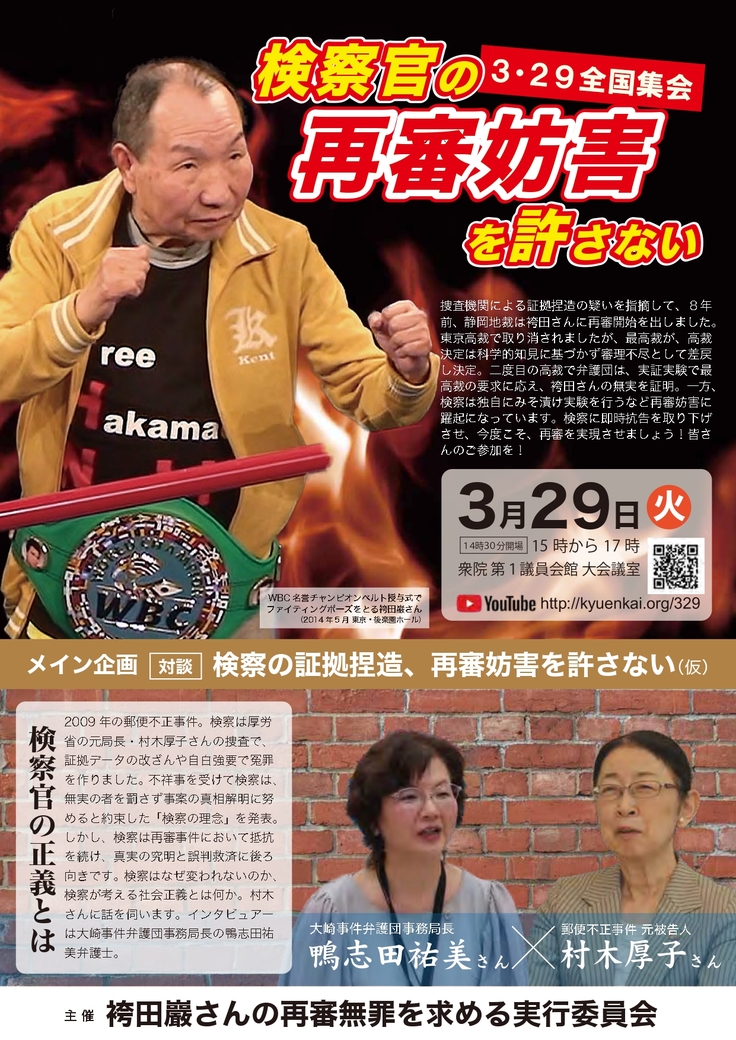 再審を求めている袴田事件で、3月29日、国会議員会館で全国集会が開かれます。今回の集会は、不服申立や証拠隠しにより再審を遠ざけようとする検察を念頭におき、「検察官の再審妨害を許さない」というテーマで開催いたします。