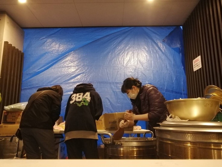 その後、災害支援団体が到着しプルート内の食事支援が始まり、続いてレストラン経営者のチームが調理全体のサポートに加わり、私たちも一緒に避難所の食事を作ることになりました。