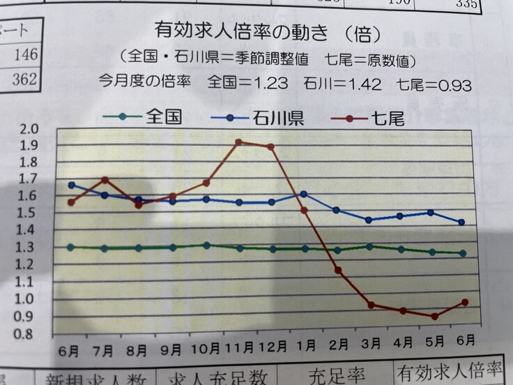七尾市は震災前有効求人倍率2だったものが震災後0.9まで落ち込んでいるようです。