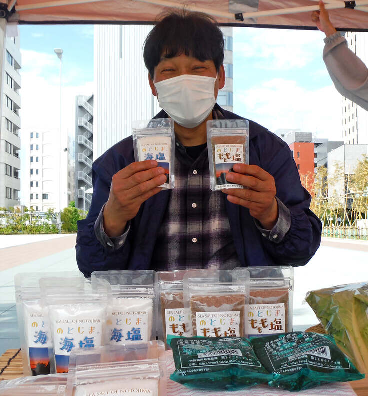 マルシェでは、直接販売を基本としていますが、これは良いという商品は少量を仕入れて販売しています。「能登島自然の里ながさき」でつくられた、海塩、ももも塩、能登島長崎の民宿浜弥さんの海藻アカモクの「花まつも」は、能登島の美しい海の幸と、その幸を守るために生まれた稀少な品で、応援したいとの思いもあり、販売しています。「初めて見た」「知らなかった」「海きれ~い」と、能登島の品に目がとまったお客様には、「能登島自然の里ながさき」の取り組みや、塩づくり小屋、長崎から眺める海の美しさや、長崎での体験談などについてもお伝えするようにしています。最近はアカモクがおいしかった!と買い求めに来られる方も増えてきました。
