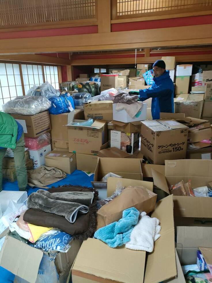 活動に賛同いただいた金沢市東山の寺院、妙国寺様の施設をお借りし、宅配会社預かりとなってい約30トン(1月末時点)、個数にして1500箱の荷物を順次搬入。