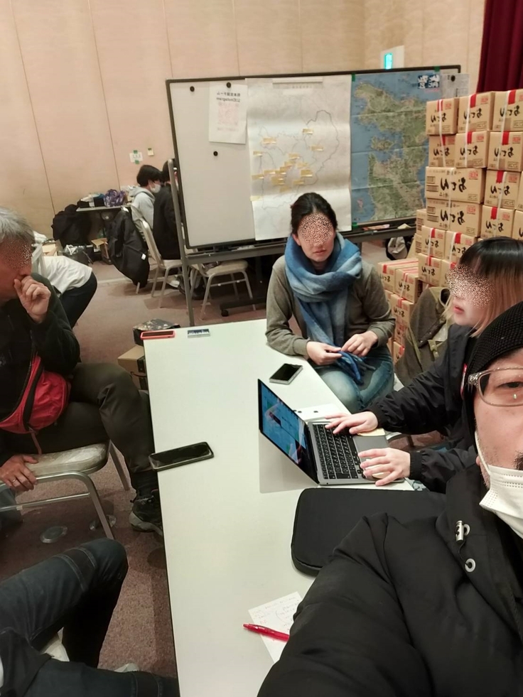 七尾市の支援拠点となっている施設「パトリア」にて、ボランティア団体:熊本支援チーム、日本レスキュー協会、地元有志と支援についての会議を実施し、それぞれの役割分担を決め効率的に支援を進める連携体制を確認。