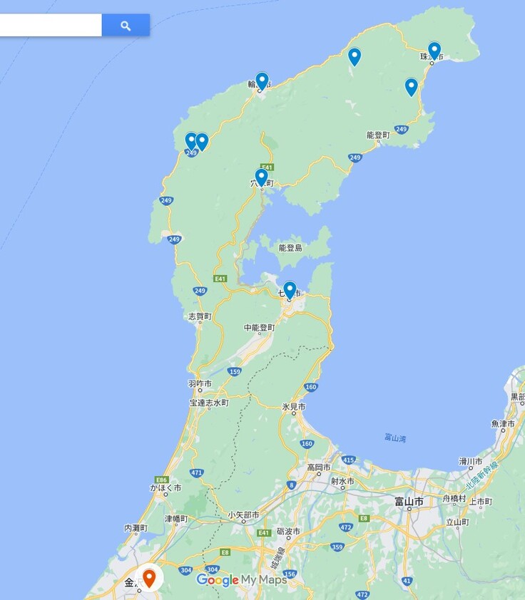 輸送箇所(複数回訪問先を記載)*青印は訪問先、赤印は弊社金沢事務所