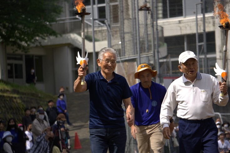 まず開会式では聖火リレーが行われ、校長先生から地域代表と保護者代表に聖火が手渡され、約70年前の卒業生に受け渡し、約60年前・約50年前・約40年前・約30年前・約20年前・約10年前の各卒業生へと聖火がリレーされました。