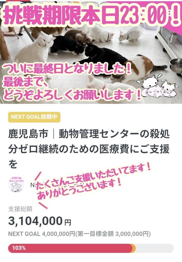 殺処分ゼロを継続する為のクラウドファンデイングが、ついに最終日となりました。