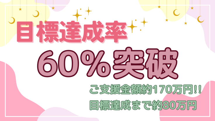 公開から10日を経過いたしました!皆さまから連日あたたかいご支援をお寄せいただき、目標の60%を達成いたしました。代理でのご支援を含め、90名以上の方にご協力いただいております。