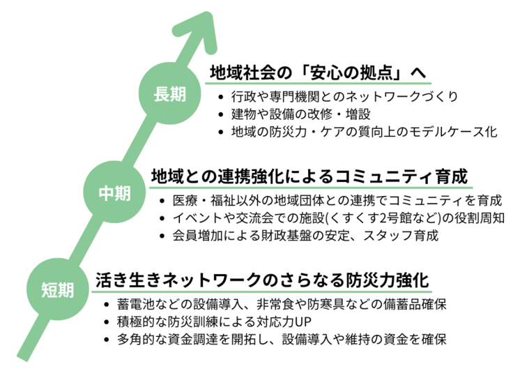 この取り組みのその先には、誰もが自分らしく生活できるコミュニティを実現し、私たちは「災害時だけでなく普段から使える安心の拠点」をつくり上げ、地域や社会に喜ばれる存在になりたいという想いがあります。