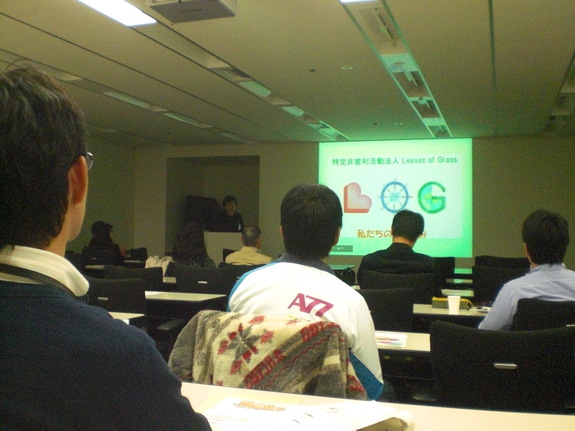 お1人は、会場に参加できなかったので、ipadを使用しSkypeにてLOGの授業を受けている感想を語って頂きました。ご自宅に居ながらにしてこうして会場と会話できることに、来場者も興味を持って聞き入ってくださいました。