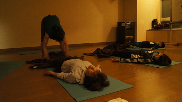写真は、ヨガが終わる5分くらい前に部屋を暗くし、動かした体を開放し、リラックスさせます。これが本当に気持ちがいいんです。先生が生徒一人ひとりの体を軽くほぐして1回の講座が終了。