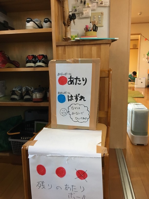 今回は、カラーボールをつかって当たりのぼーるを、不正がないように直接本人にひいてもらうことにしました。