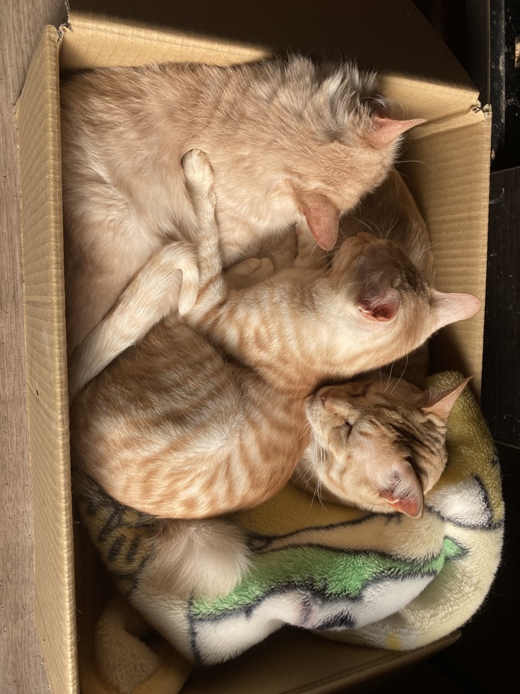 小さな段ボールの中で、ぎゅっと身を寄せ合って眠るこの姿は、安心できる場所があるからこそ見せてくれる表情です(まさかの段ボールですが…笑)。