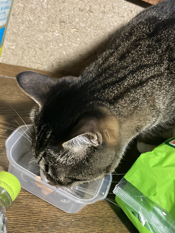 この子は、まだ人との距離を感じている子ですが、容器からならちゅーるを食べてくれるようになりました!