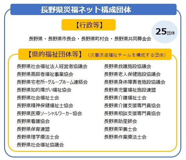 長野県災害福祉広域支援ネットワーク協議会(長野県災福ネット)は、災害に備えた福祉事業所間の相互応援の仕組みづくりや、福祉避難所の備えの促進、長野県DWAT(災害派遣福祉チーム)の養成、福祉団体間の連携促進などに官民協働で取り組んでいます。