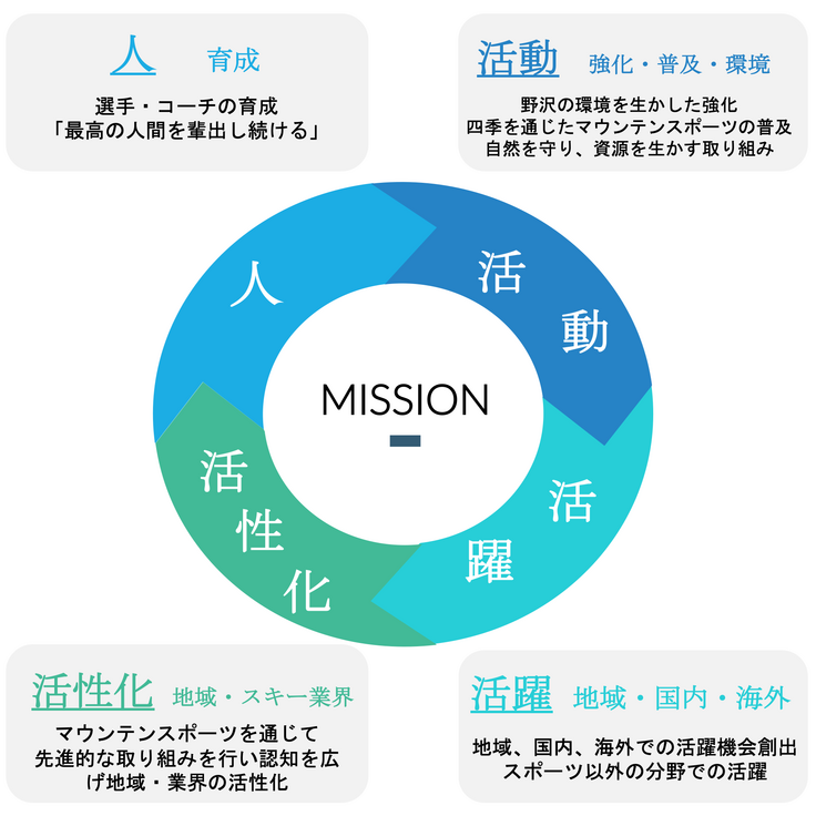 クラブが支えてきた循環を止めず、さらにより良いものにするためにマウンテンスポーツを通じて人を育て、さまざまな活動を行い、活躍の場を創り上げていきます。