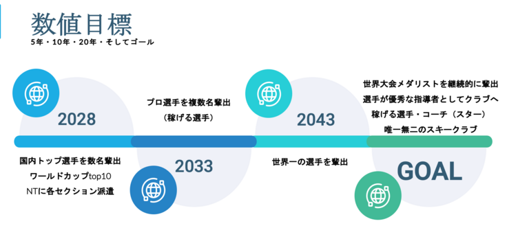next100プロジェクトの目的は、クラブが最高の人間を輩出し続ける組織であるべく、育成環境の向上、環境整備などを促進していくことです。スキー・マウンテンスポーツを通して育った子どもたちが野沢温泉で、そして世界で活躍するための育成環境を作り上げ、 2043年クラブ創立120周年の際には世界チャンピオンを輩出を目指します。