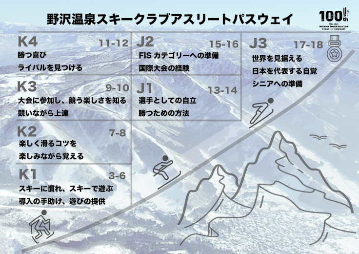 この100周年をきっかけに、野沢温泉スキークラブは持続的かつ効果的な人材育成、選手強化を行うべく新たな組織へと進化していきます。