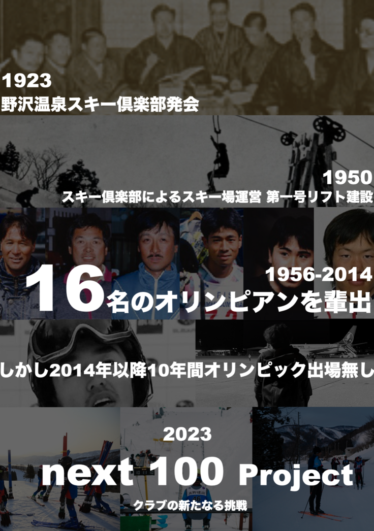 〜前略〜 野沢温泉スキークラブは2023年12月に創立100周年を迎えます。これは野沢温泉スキークラブにとって次の100年に向けたスタートであり、新たなチャレンジの始まりです。今の私に何ができるのか?それは次の100年に向けた野沢温泉スキークラブの活動をより応援し、次の世代を担う人材育成をサポートすることです。私と一緒に、これからも野沢温泉スキークラブから世界を目指す人材を支援していただけますと幸いです。