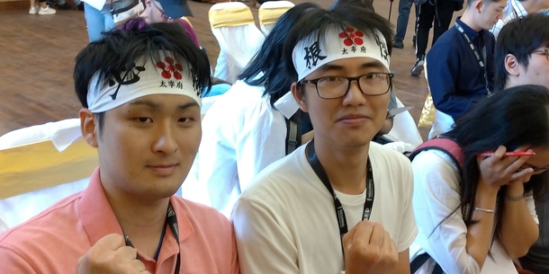 予選前の名古屋大学の二人はハチマキを巻いて気合十分な様子でした。