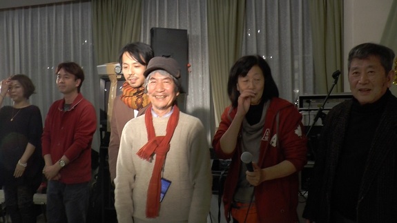 ここで、映画製作スタッフを紹介します。右から総監修の蔵原監督、監督杉浦、大極カメラマン、川井助監督、音楽担当、作曲家の武藤さん、ポスターやチラシのビジュアル担当尾山さん。みなさんボランティア精神でがんばって頂いています。ここには映っていませんが、版画を提供してくれた東京版画研究所の講師石橋さん、コピーライターのマリちゃん。そのほか、多くの皆さんに支えて頂き、映画が進行しています。皆さんも、是非、参加して頂き、映画を一緒につくりあげませんか。日本文化をわれわれの手で、世界へ紹介しましょう。