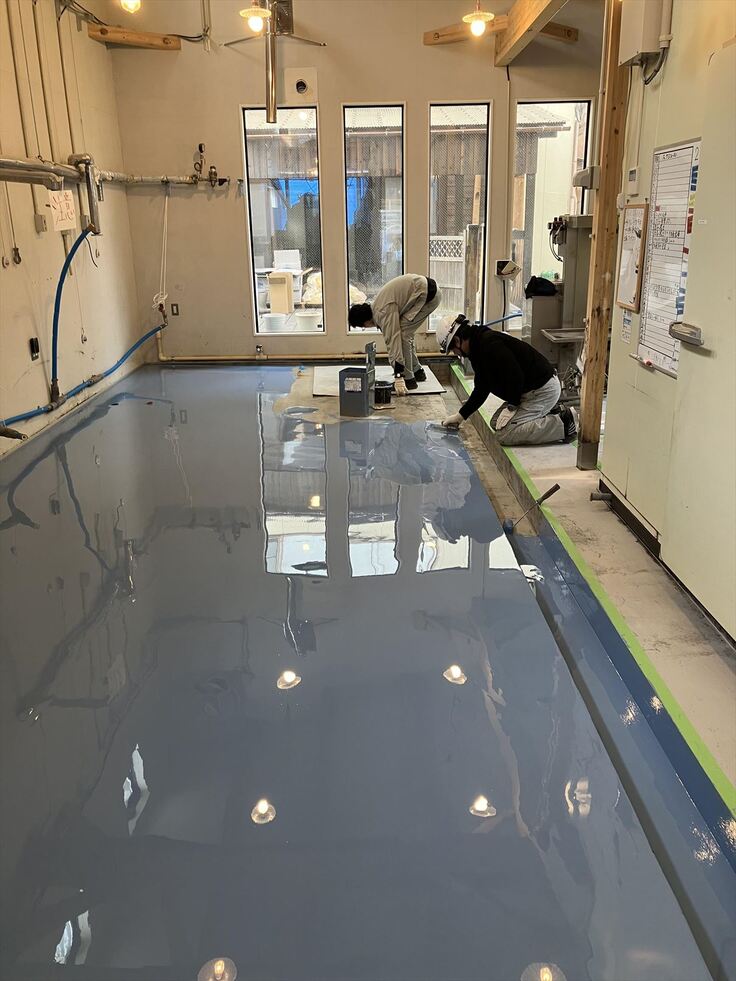 写真は、既存設備をそれぞれ次の持ち主に引き渡して、空っぽになったブルワリーの床の防水塗装をしている様子です。