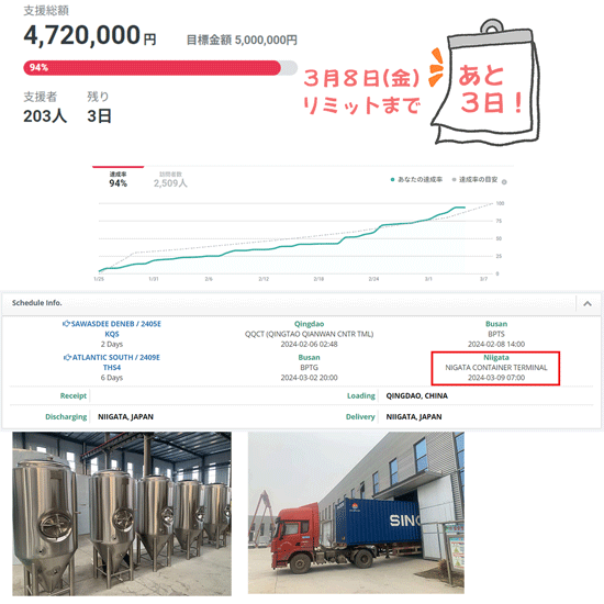 【目標の94%まで来ました!あと3日! 新醸造設備は新潟港に9日到着!】