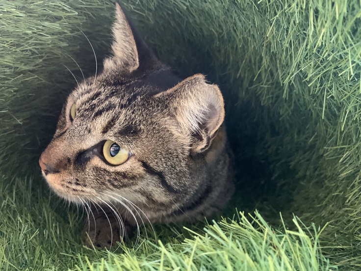 ベランダの人工芝生のトンネル(余ってたのを丸めただけ)に興味深々のベルちゃん