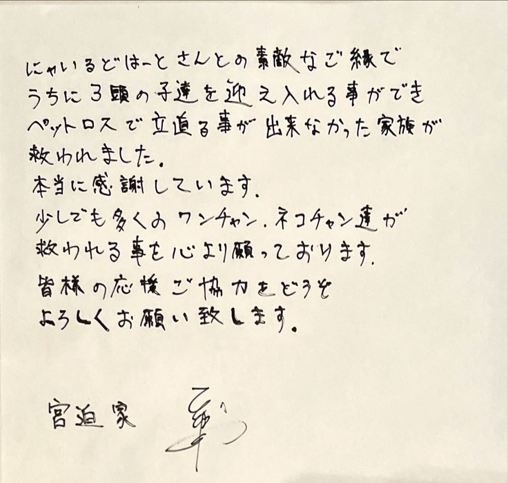 親子を迎えるきっかけが宮迫家様のジョリー一家だと伝えましたらご夫妻揃って嬉し泣きをしながら