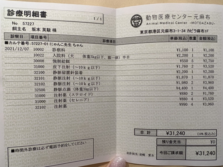 そのため、週2回病院で静脈点滴をすることで出来る限りの毒素の排出を促しています。しかし入院費は高額で一回の預かりで平均3万円ほどかかります。にゃんこ先生は容体が安定していないので、何か病が併発する度に別の治療もする必要があり、そうすると1日で5万以上飛んでいくこともザラにあります。