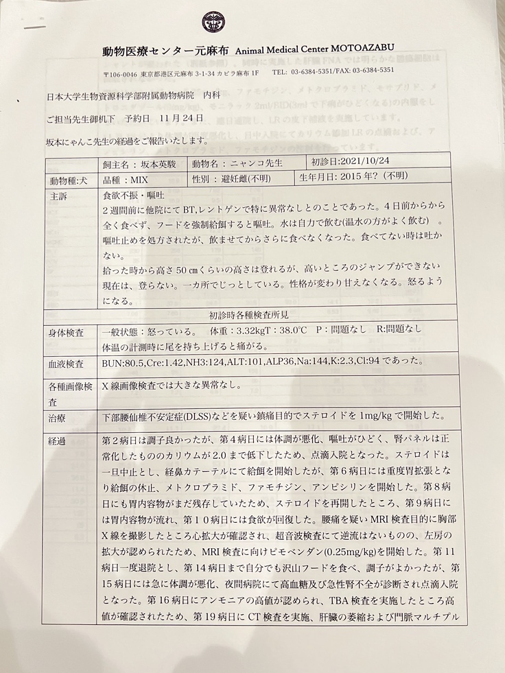 諦めきれず相談したところ、主治医に「ここで難しいと言われたらいま日本でにゃんこ先生を手術出来る人はいない」と日大動物病院の紹介状を書いてもらう。