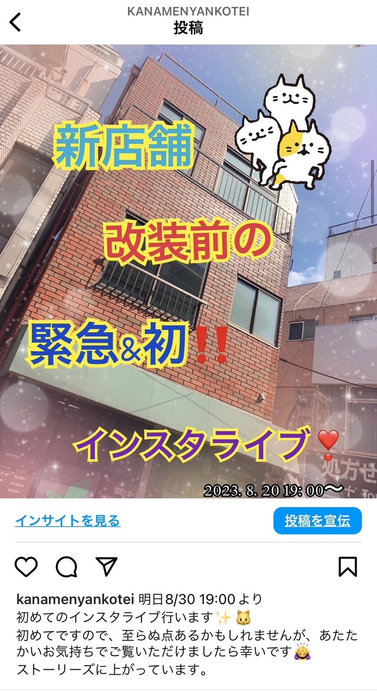 最終日前日ということで、にゃんこ亭初の緊急ライブを開催したいと思います。今回のクラウドファンディングのお礼とともに、新店舗のご紹介もできればと思いますので、ぜひご参加ださいませ!