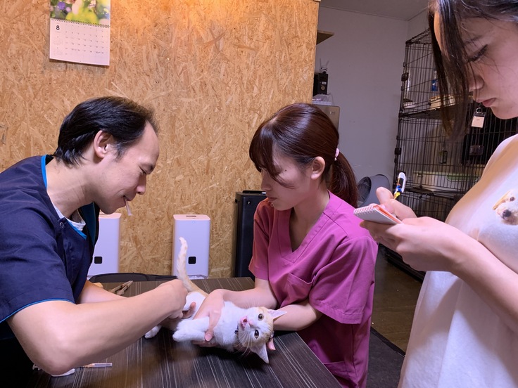 東京シェルターでの初期医療|未来を担う若き動物看護士の学生さんとともに。