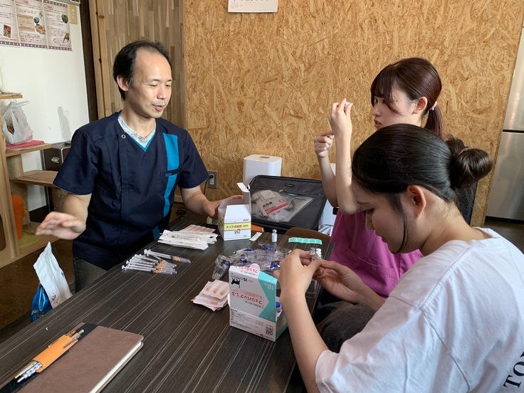 この日は、上板にゃんこ亭のスタッフとも働いてくれている看護学生に参加してもらい、実習教育を行ってます。