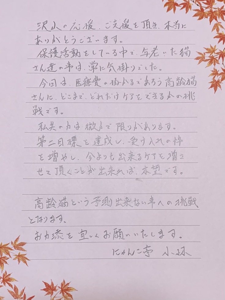 ※ 特別なリターン品をお届けしない代わりに、ご支援のほぼ全てをプロジェクトに充てさせていただきます。猫たちのためにありがとうございます。