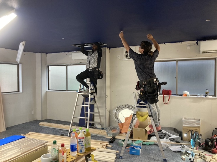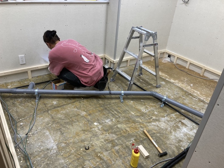 天井や壁・床に隠れる電気の配線や給排水の配管の仕込みも終わり、床組を開始してます。