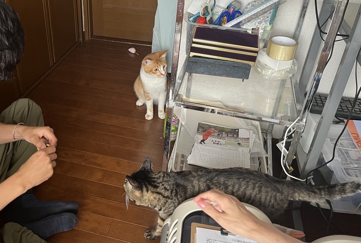 心ちゃんは、最初は隠れてしまいましたが、時間とともにウロウロとし出して、ちゅーるも完食するほど余裕でした