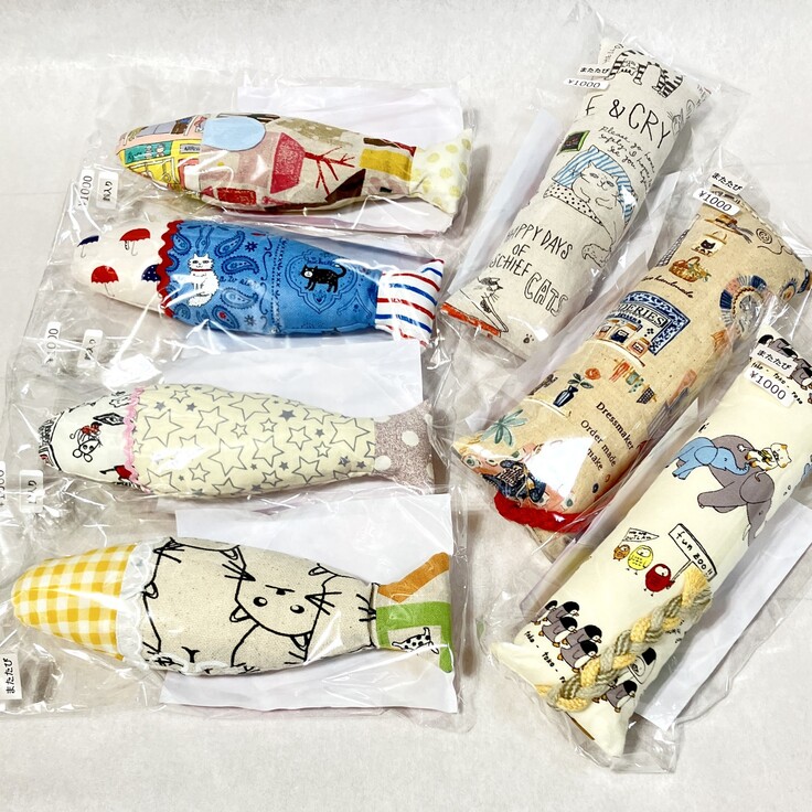 布小物や猫のおもちゃなどのハンドメイドチャリティーグッズはとても可愛く丁寧な仕上がりで大好評です。