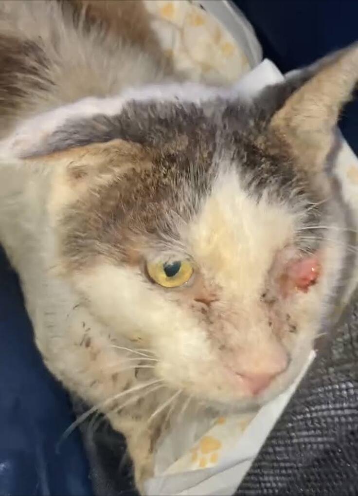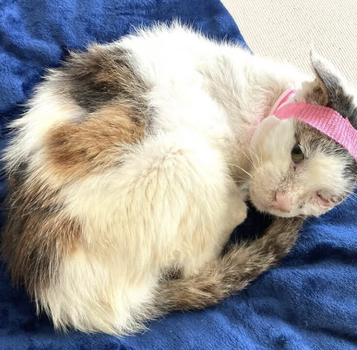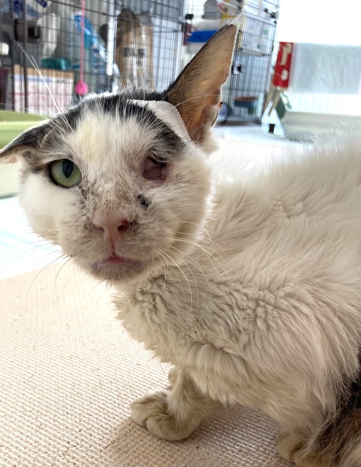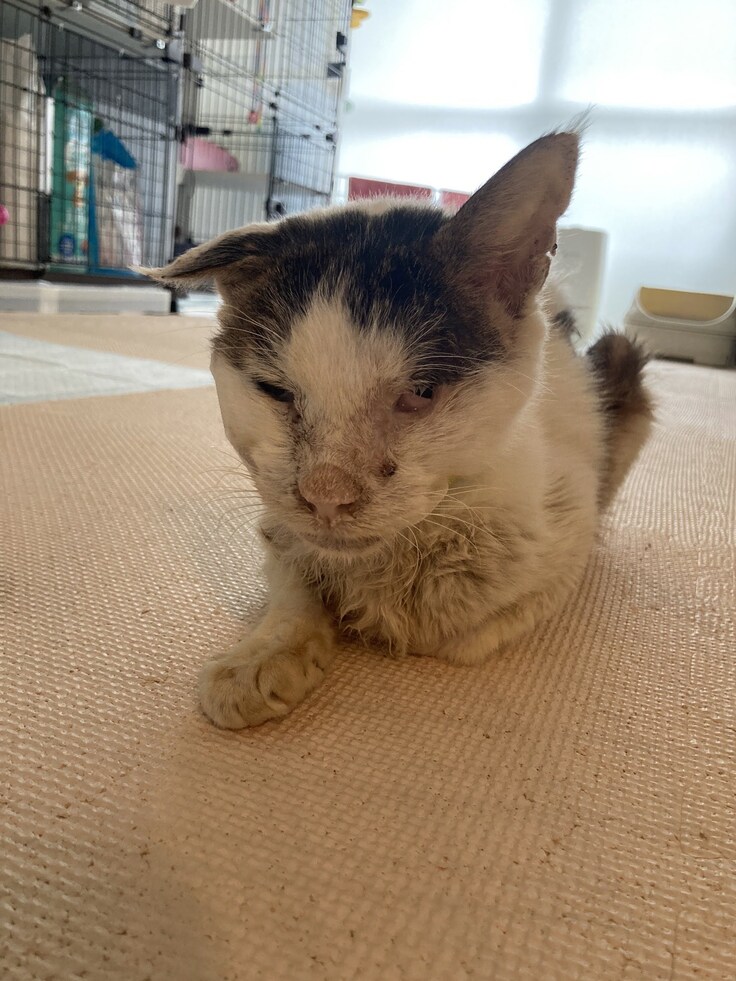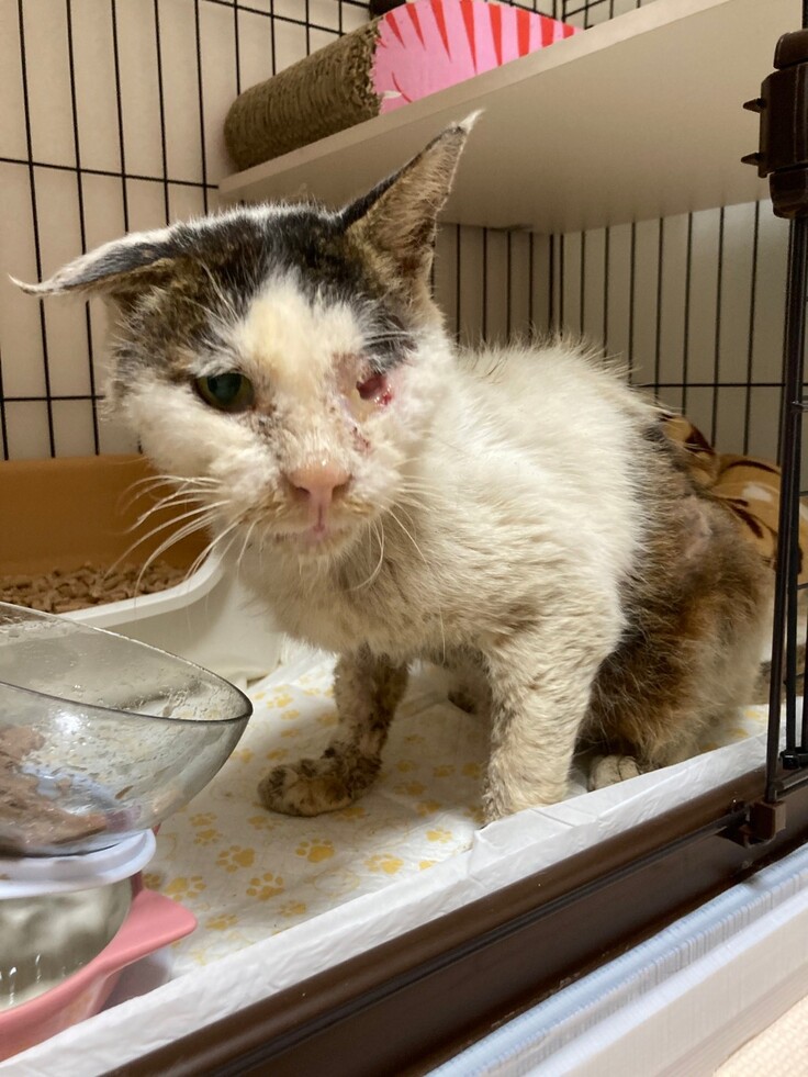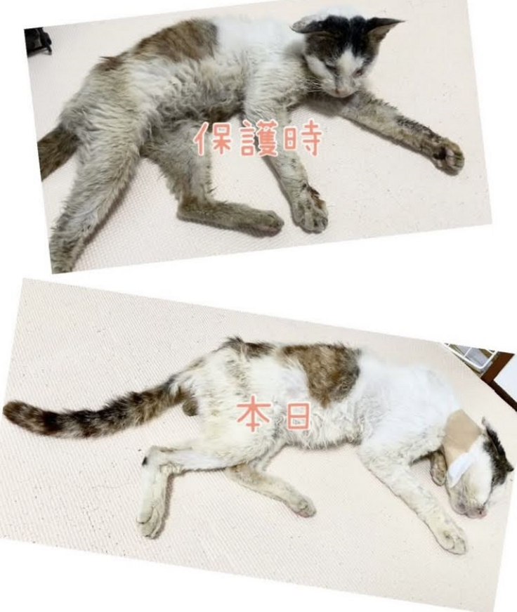 保護した時の大吉君は、エイズキャリア、貧血と飢餓状態、左眼球がなく、耳の骨も曲がったまま固まり、喉には腫瘍ができ膿がたまり、内臓(特に腎臓)の数値もとても悪く、余命3ヶ月と言われました。
