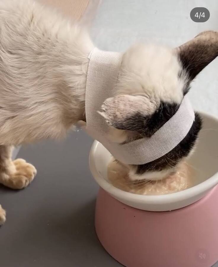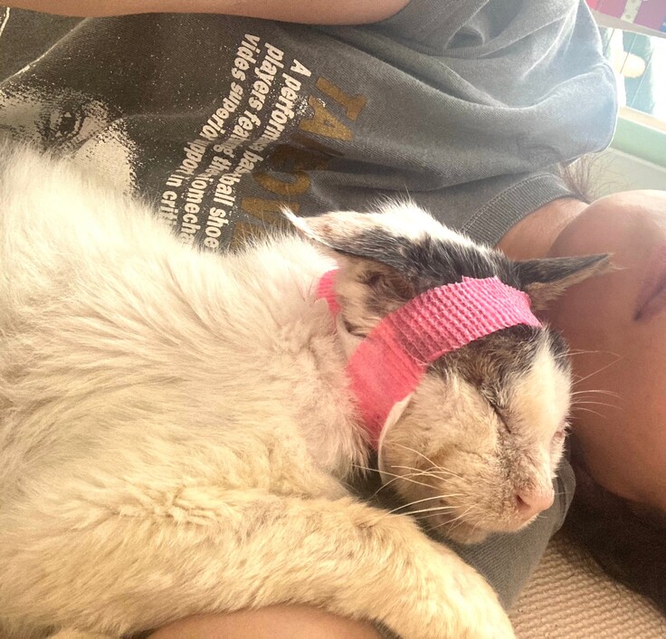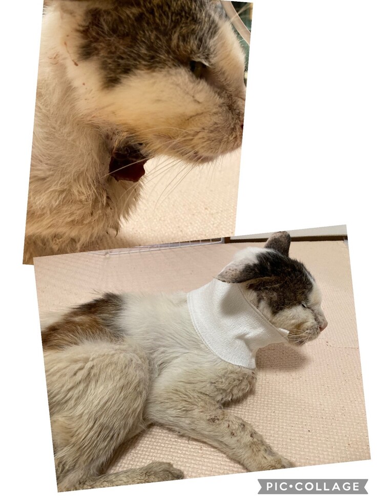 体重が少しずつ増えてきたので、右頚部の腫瘍はサードオピニオンまでして頂き、体力的なことなどを考慮し、大きく切除はせず、膿を取り除き、ステロイド剤を塗布し、包帯を巻くことにしました。